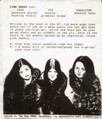 As a live band Pink Kross really knew how to present themselves. Serious about their music they were also relaxed enough to have some fun too – something some of their contemporaries could have learned from. Often as not costumes would be worn that would raise smiles, even in ‘normal’ stage clothes the band exuded an edgy garage-punk-chic that reminded me of the playful Space Kittens and the more menacing, The Social Lepers. I’ll move on quickly before I get all gooey-eyed about The Space Kittens. Occasionally, at later gigs, Fraser (P.H. Family) would join the band for a thoroughly riotous version of Smug and I’d be in the audience, looking on, feeling lucky, elated and just a tad smug, just because I was there. In that room, at that moment. Ahhh … Pink Kross.