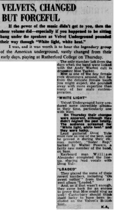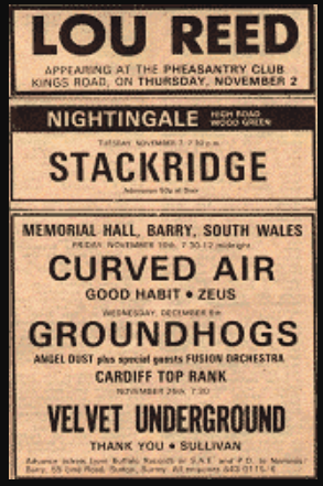 Striking a deal with a promoter for another advance, Yule’s Velvet Underground toured the UK for nine shows in 1972 playing such establishments as St David’s University in Lampeter, Wales and the Northamptonshire County Cricket Club (nothing says big time like County Cricket Club). A show at the Top Rank in Cardiff, Wales was featured on the same newspaper advert as a Lou Reed show. This proved not to be the only notable thing about the gig in Wales;