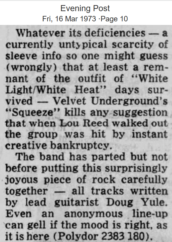 What is true is that the press of 1972 where pretty much on-board with this line up of The Velvet Underground. Copies of Squeeze were promoted in newspaper columns in reviews and offered up as competition prizes. The modern opinion is that the band and the album was instantly derided by the press and the public saw through it all as sham. This isn’t true. While most contemporaneous reviews of the album are mediocre, there is also the odd one that shines.