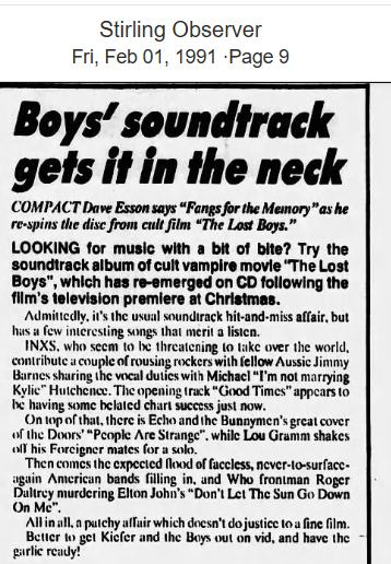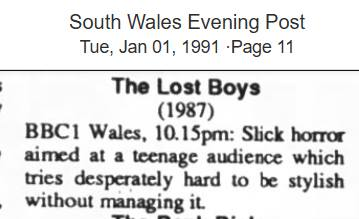 Fast forward to 1991. the Lost Boys made its UK TV debut on January 1st (around six months after the US). A whole new generation of 13, 14 and 15 year olds discover the film and the original audience gave it a nostalgia watch. A passing of a torch perhaps (the video was so popular that it was released in 1988 and then re-released in 1989, 1992 and 1994.)