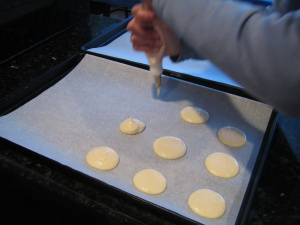 4. Working in two batches, fill a pastry bag fitted with a 1/4 inch diameter plain pastry tip with batter. (Batter will be thin and will drip from bag). Pipe batter in 1 1/4 inch rounds on baking sheets, spacing one inch apart. (Cookies will spread slightly). Let rest on baking sheets at room temperature for 20 minutes.