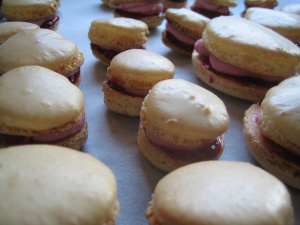 8. Gently press macarons, jam filled side down, onto buttercream coated macarons. Place on sheet. Cover and chill overnight.