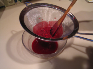 2. Measure 1/2 cup of raspberry mixture and strain into a small bowl. Cool strained jam and jam with seeds separately.