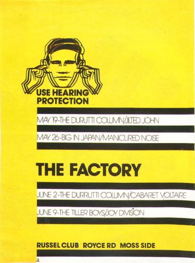 The Russell Club was a West Indian nightclub on the fringe of the infamous Hulme Crescents, a bleak high rise development condemned as the worst social housing stock in Europe. In May 1978 Tony Wilson and Alan Erasmus initiated their own Factory night to promote ‘the next music’ generally, and management proteges The Durutti Column in particular. Talented art student Peter Saville was paid £20 to design a poster, but delivered it only after the first of the initial four Factory nights had taken place.