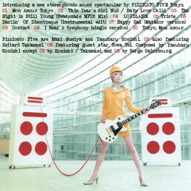 Because Made in USA was the album that tastemakers and TV and film editors picked up on the most, it became a “greatest hits” album by default, and it would be too easy for this Imaginary Compilation Album to turn into a slightly modified version of that collection. Fortunately, with Pizzicato Five being so ridiculously prolific, there was plenty of material to choose from. I have included one song which is also on Made In USA, but in a different version, so this imaginary compilation can be considered a sort of companion piece to that real one.