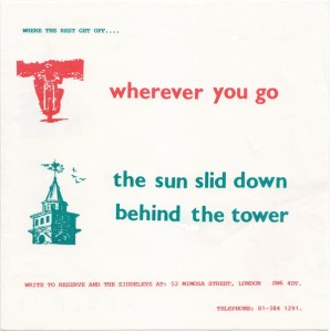 Band members came (from Bob) and went (to James Dean Driving Experience) before the luminous ‘The Sun Slid Down Behind The Tower’ appeared on a Sha La La flexi in 1987 (shared with The Siddleys), given away with Trout Fishing in Leytonstone fanzine. It then appeared again on Reserve’s only stand-alone release, 1988’s Two Hearts Beat In A Hole EP.