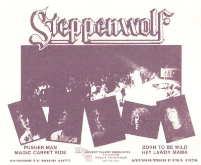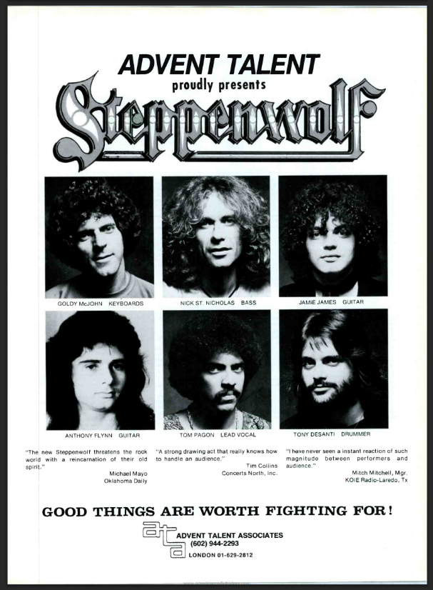 In late 1976, founding member and Keyboardist Goldy McJohn reached out to his former bandmate, Nick St. Nicholas, to tell him that that a promoter had expressed an interest in putting together a new line up of the mighty ‘Wolf. Steve Green of Advent Talent Associates out of Phoenix, Arizona was a promoter who specialised in band reunions. The acts on his roster were often only loosely connected to the actual bands they purported to be. Green hatched the idea to ‘reform’ a Steppenwolf band with as many original members as he could.
