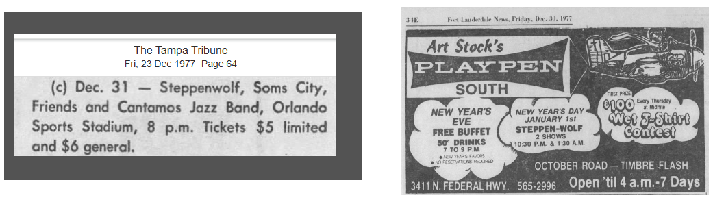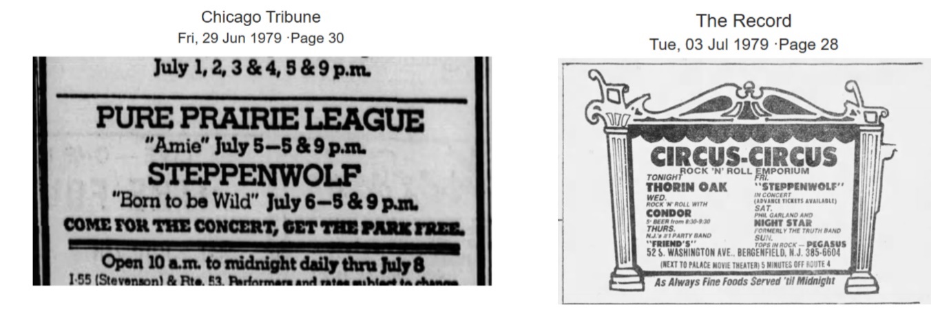 (Adverts for two Steppenwolf shows on Friday July 6th 1979, one in Chicago and one in New Jersey. A 12 hour drive away from each other)