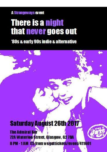 One of the most enjoyable events in many a year happened just a few months back at The Admiral Bar in Glasgow when Strangeways (a collective made up of Robert, Hugh and Carlo) held their first ever There Is A Night That Never Goes Out. I was lucky enough to be asked to contribute a short set at the beginning of the night before the professionals took over. I wrote about it all afterwards.